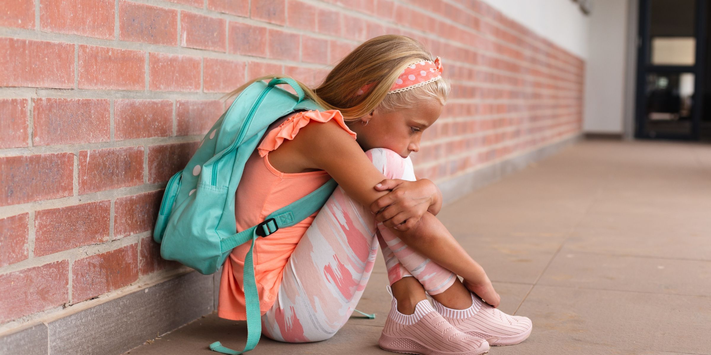 Sie trug eine Schuluniform, die Knie an die Brust gezogen, den Rucksack neben sich auf den Boden gelegt.