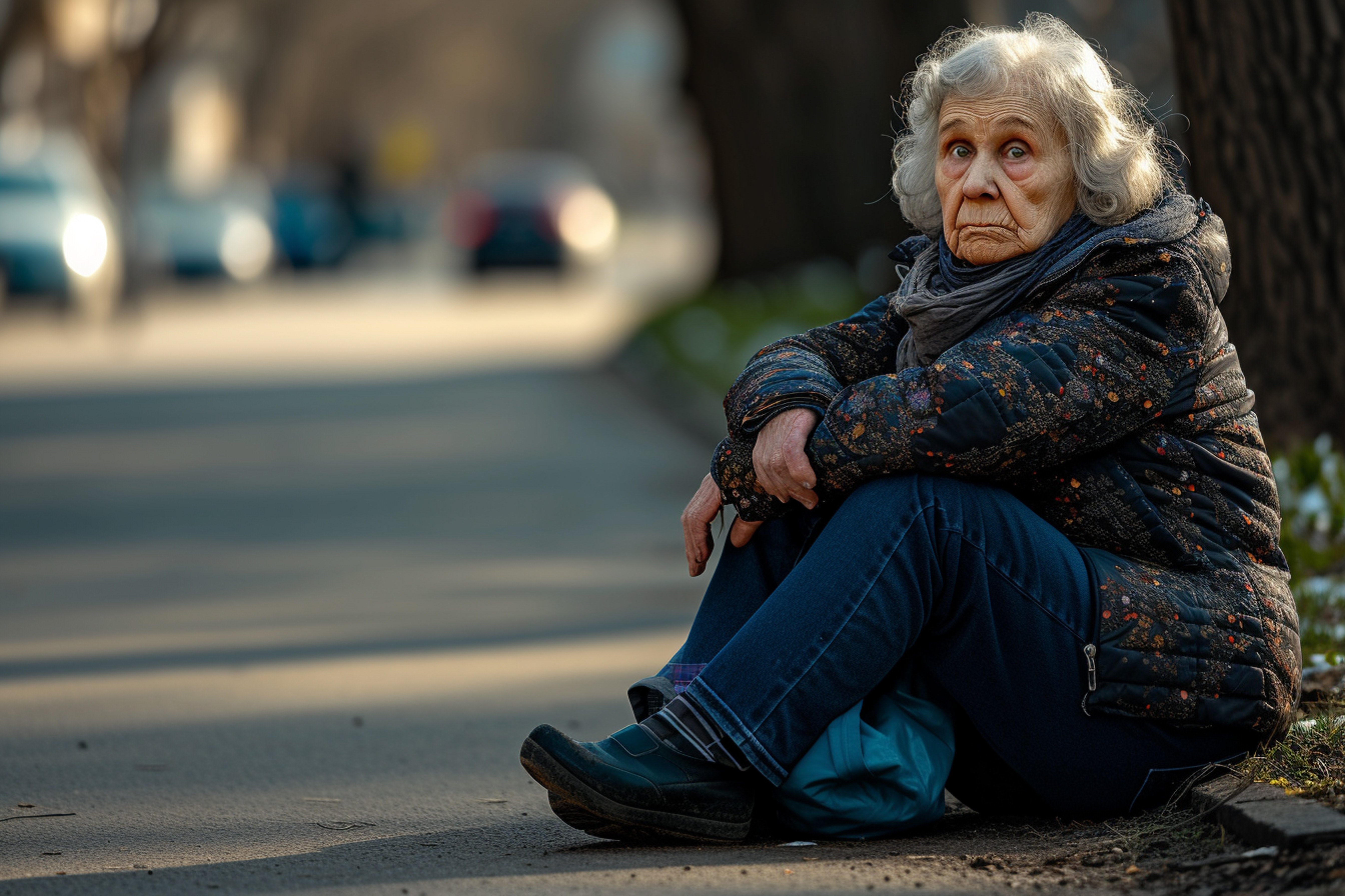 Zamiast tego, pod brzęczącą latarnią uliczną, zobaczyłem starą kobietę boso w cienkiej bawełnianej koszuli nocnej, trzęsącą się tak mocno, że kolana prawie się ugięły. Jej bransoletka alarmowa mówiła: