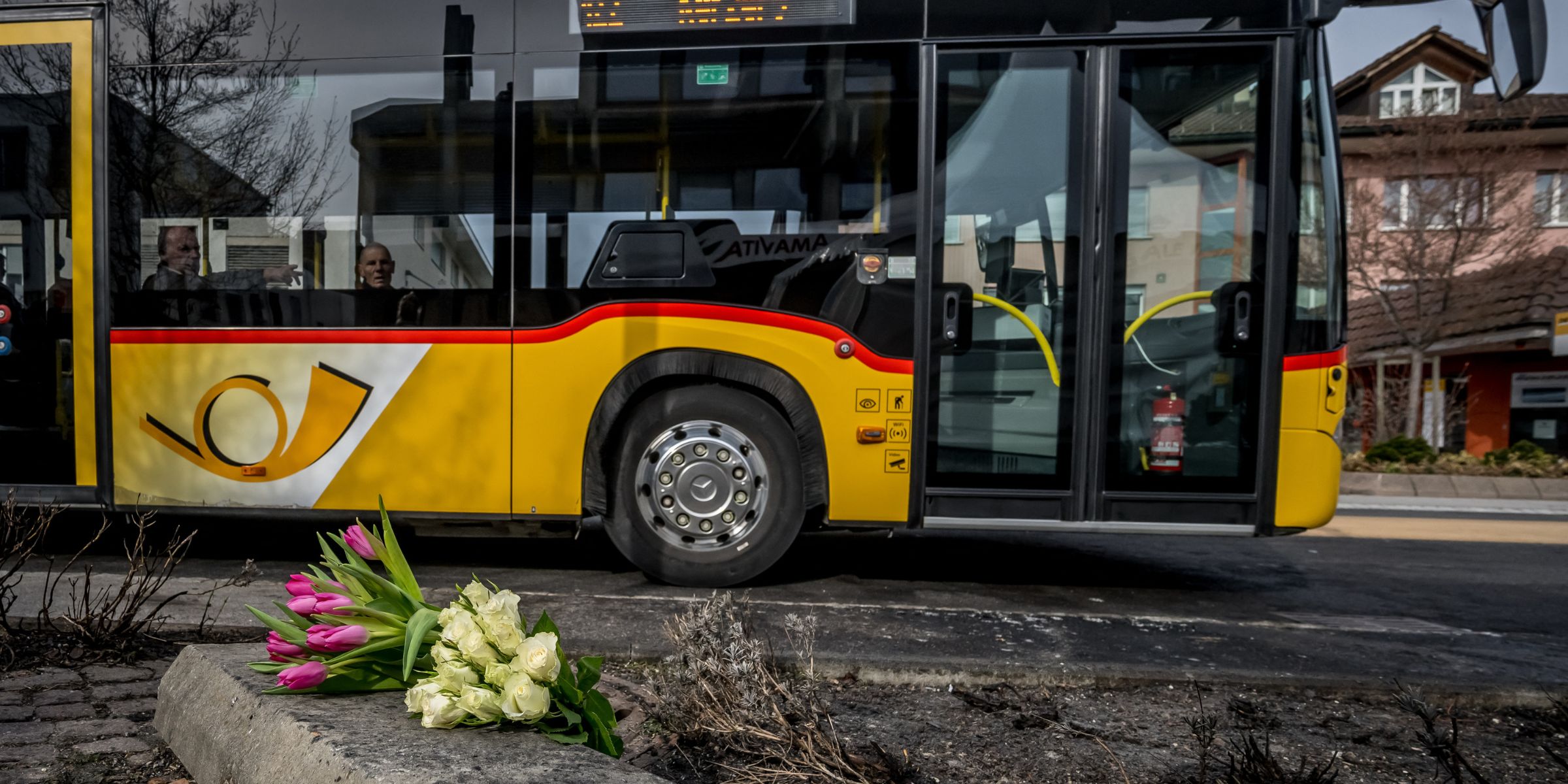 Ein Postbus fährt am 11. März 2026 in Kerzers in der Westschweiz an Blumen vorbei, einen Tag nachdem ein Bus desselben öffentlichen Unternehmens am 10. März 2026 in Brand geraten war. Dabei kamen mindestens sechs Menschen ums Leben und fünf weitere wurden verletzt. Nach Angaben der Polizei könnte es sich um eine vorsätzliche Tat handeln. | Quelle: Getty Images
