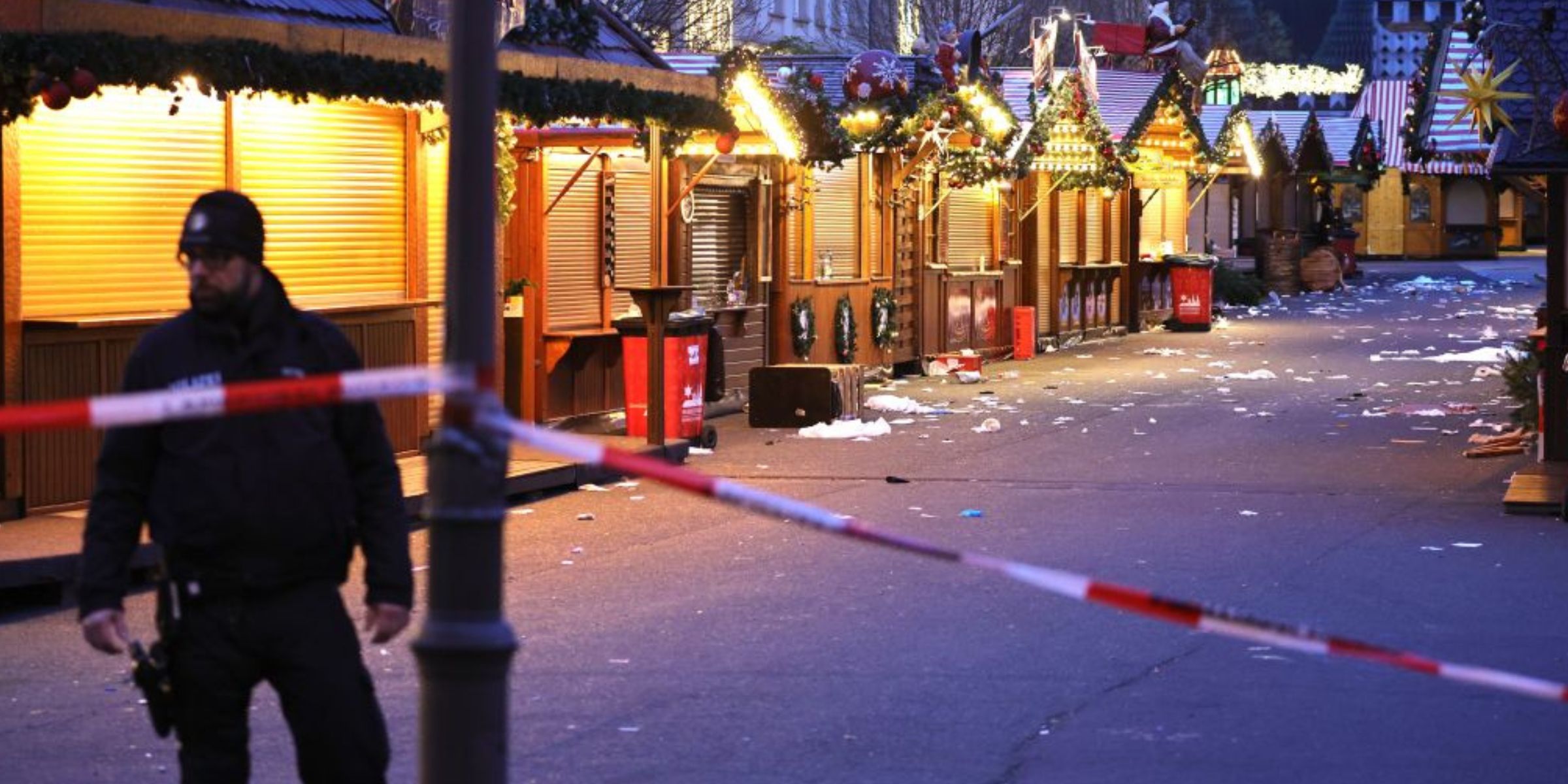 Auf dem Gelände eines Weihnachtsmarktes in Magdeburg, Ostdeutschland, sind am 21. Dezember 2024 Trümmer und geschlossene Stände zu sehen, nachdem ein Auto in den Markt gerast war. Dabei gab es mehrere Tote und Dutzende Verletzte. | Quelle: Getty Images